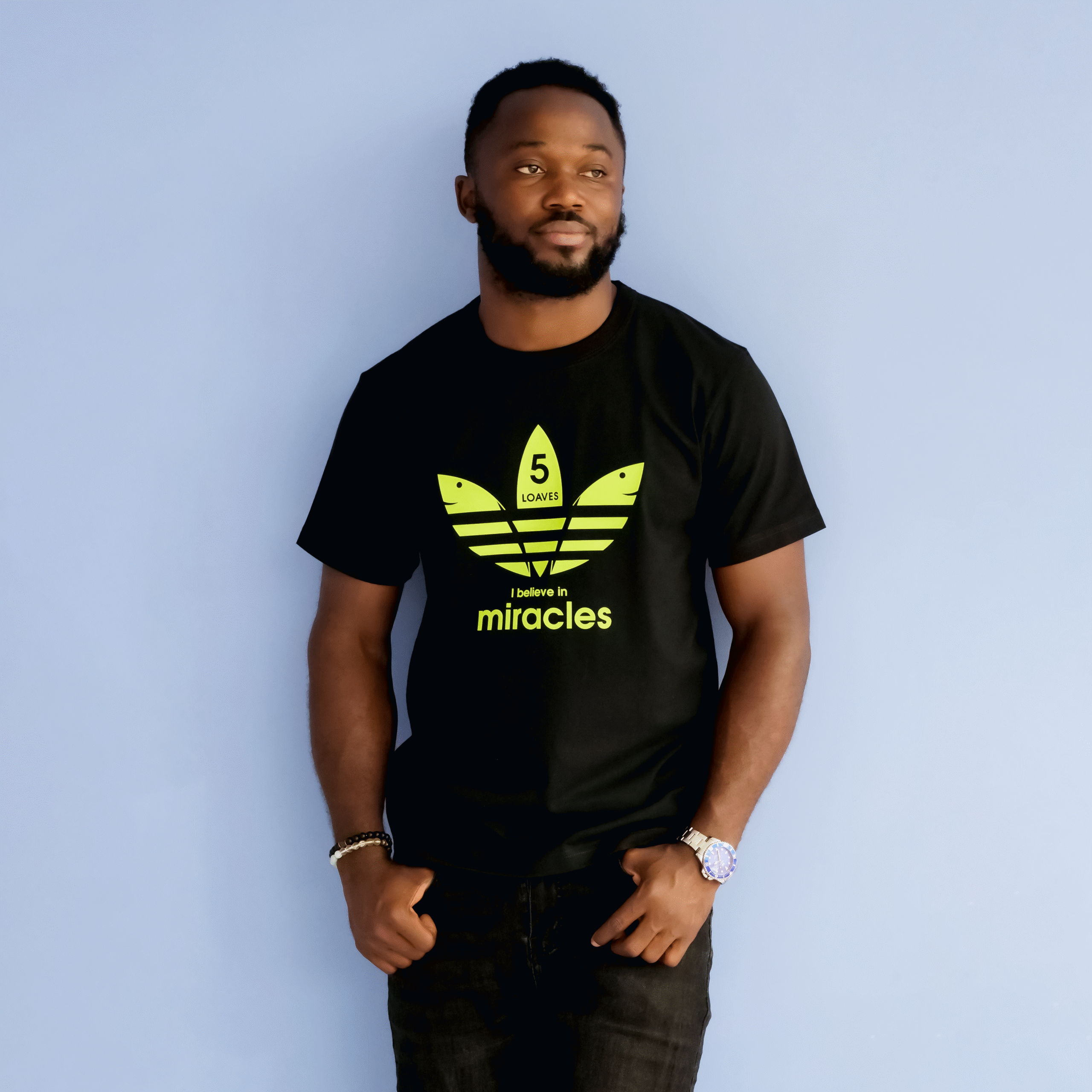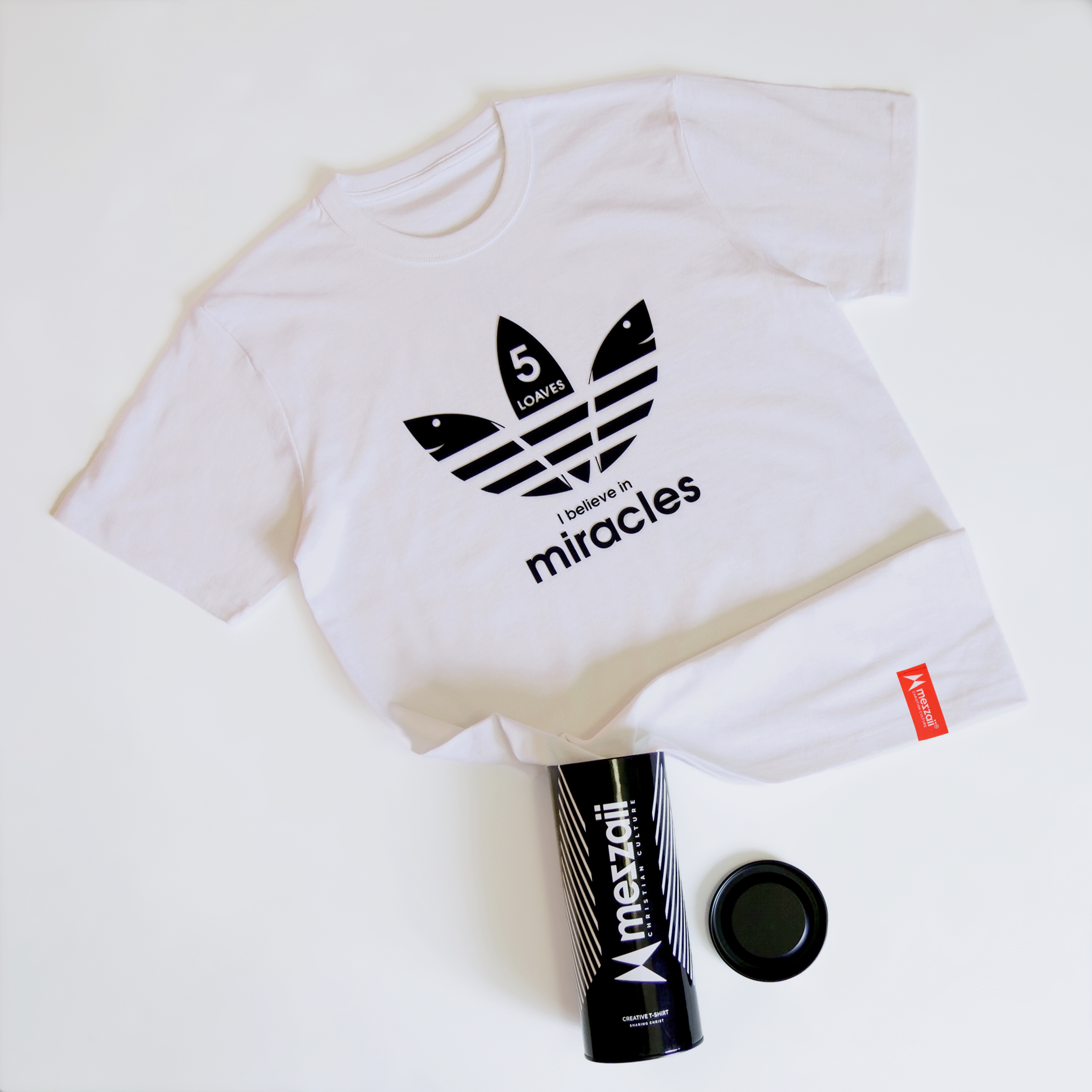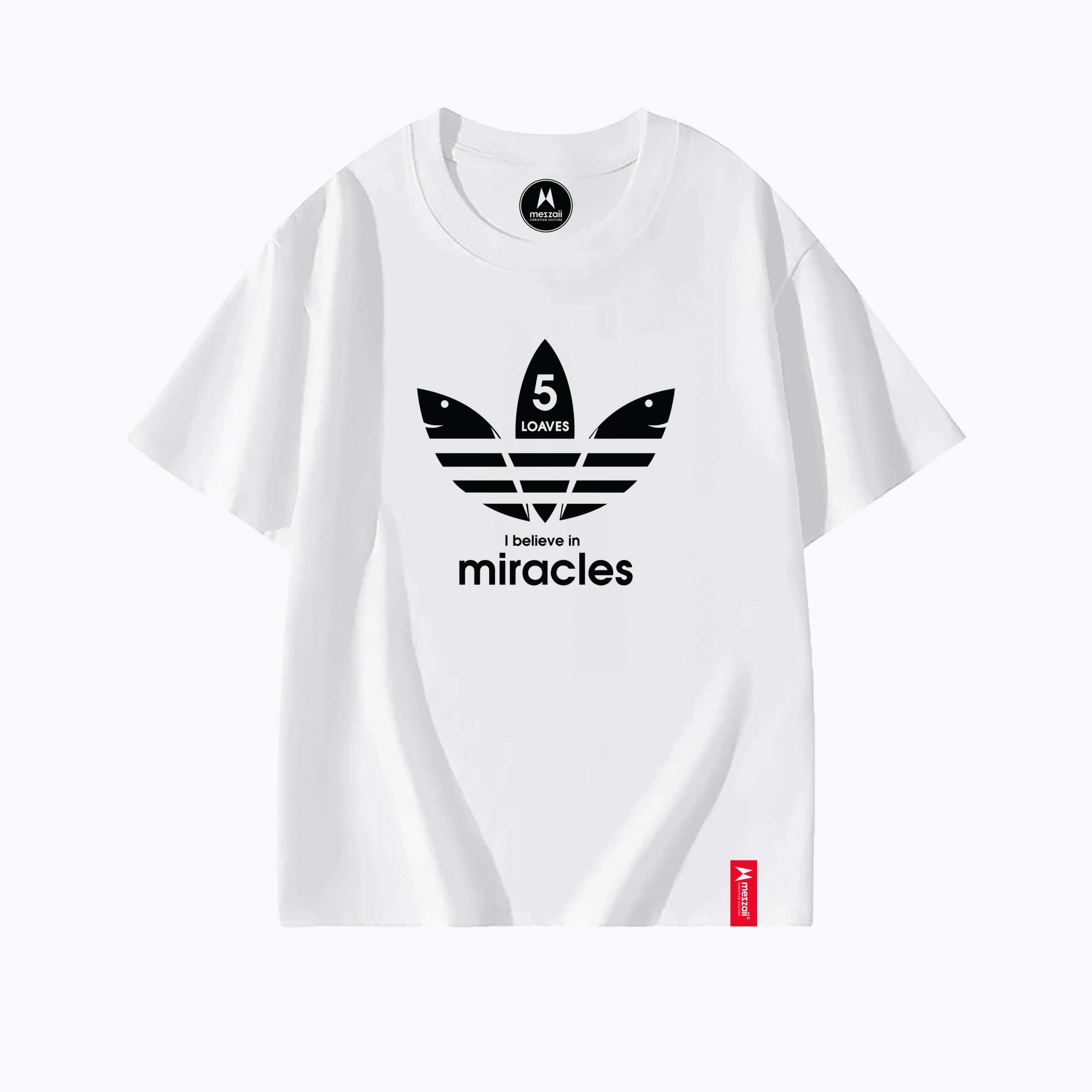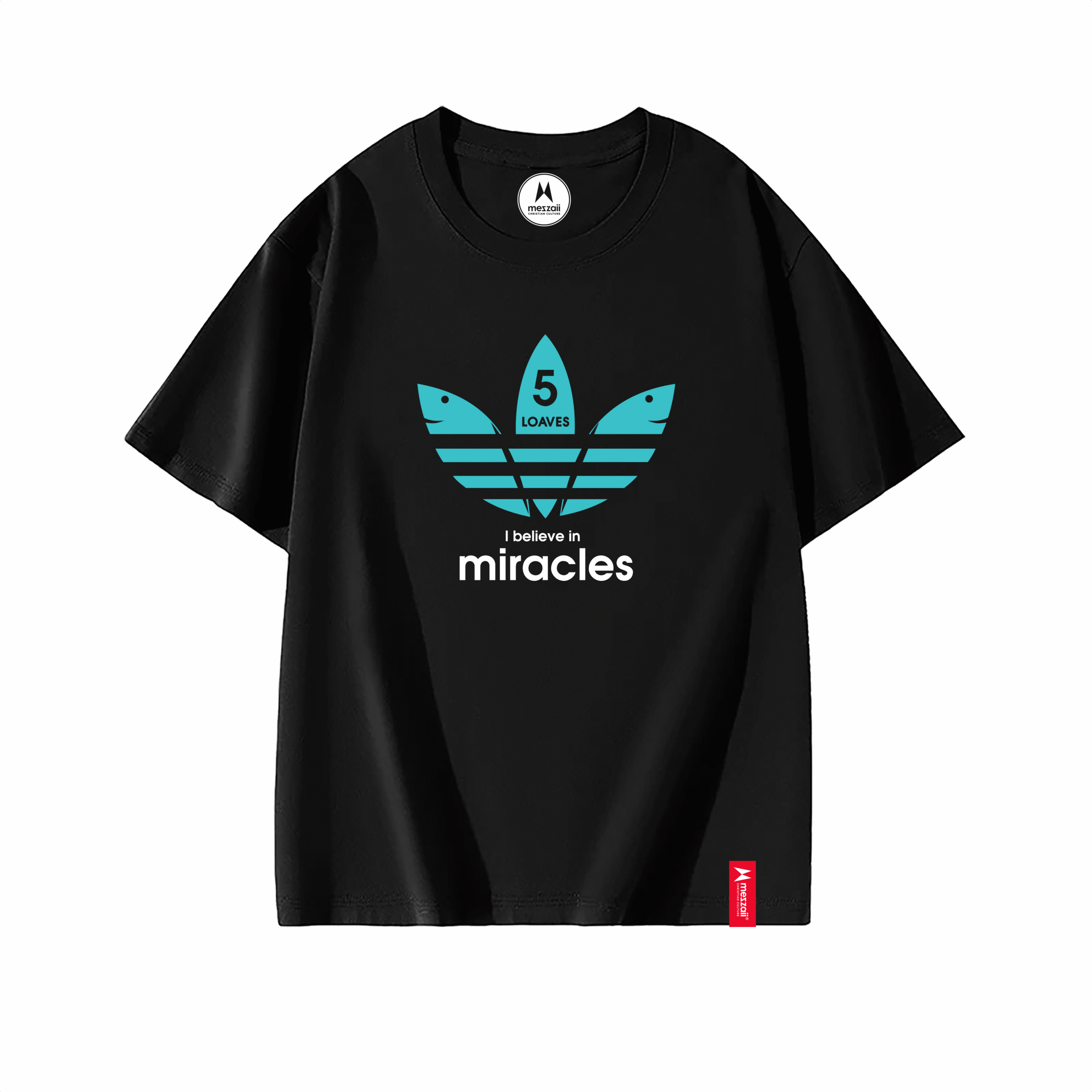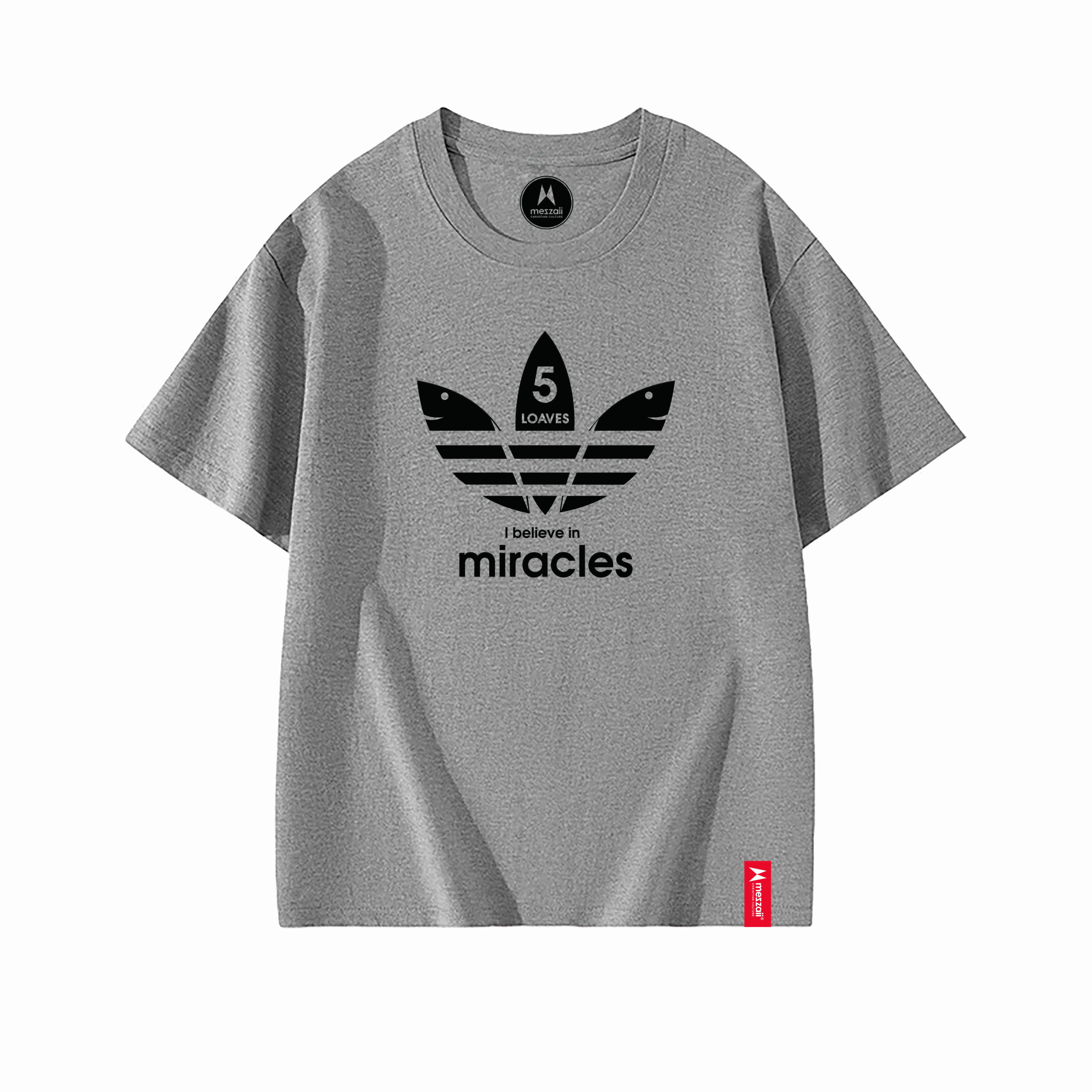 Step out in faith with our exclusive “I Believe in Miracles” tee from the Mezzaii Christian Culture collection. This powerful design transforms iconic sportswear brand into a testimony of God’s miraculous power, referencing Jesus feeding the 5,000 with just five loaves and two fish.